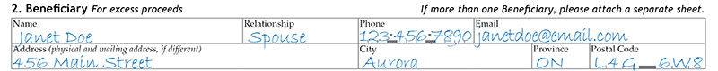 - Include the beneficiary’s mailing and physical address(es), phone number and email address (if available).