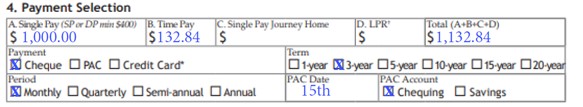 Example: Single Pay/Down Payment ($1,000) + Time Pay ($214.20) = Total Amount of the first cheque or draft ($1,214.20)