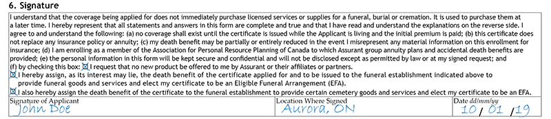 - Check the second box if the contract includes cemetery items that are to be identified as an Eligible Funeral Arrangement.